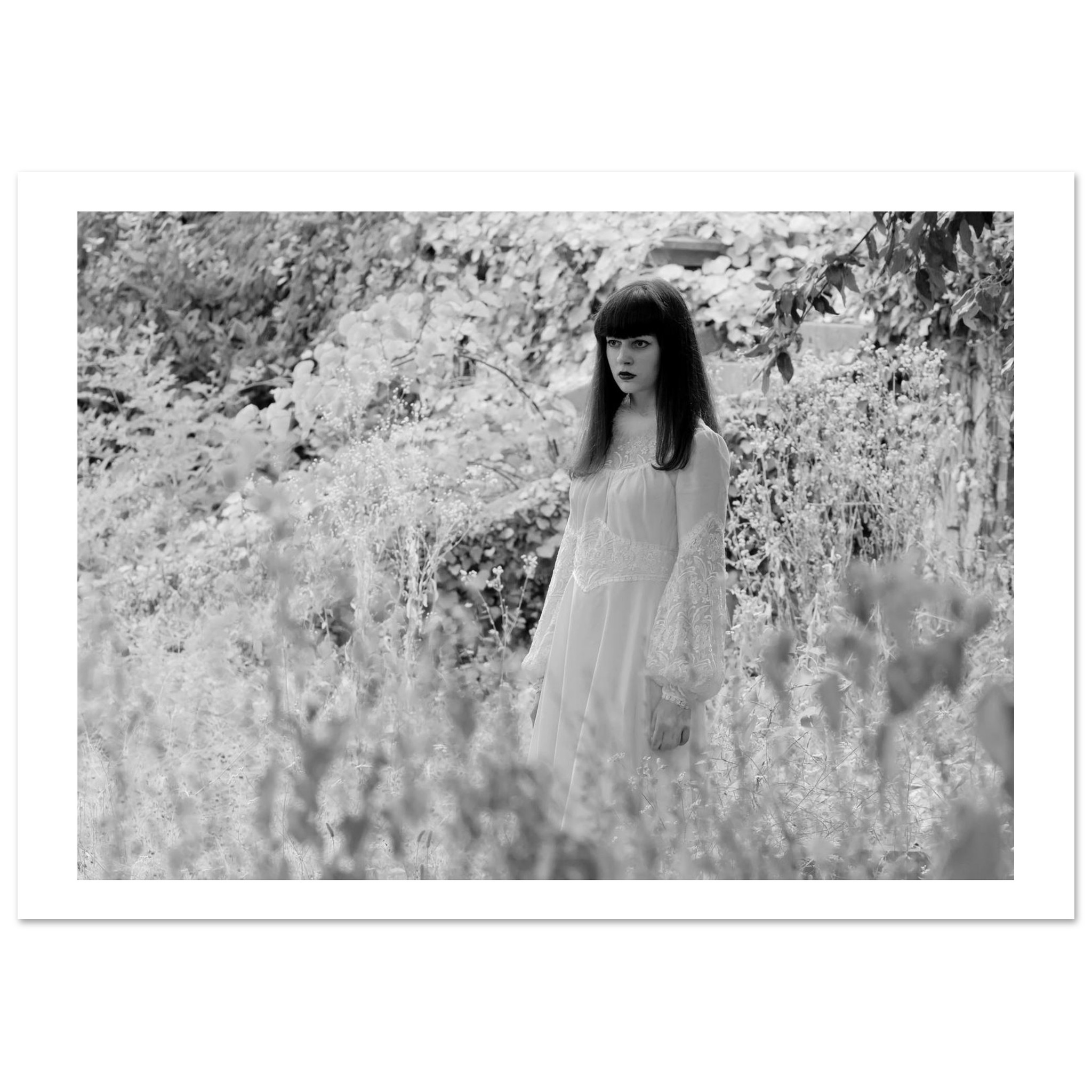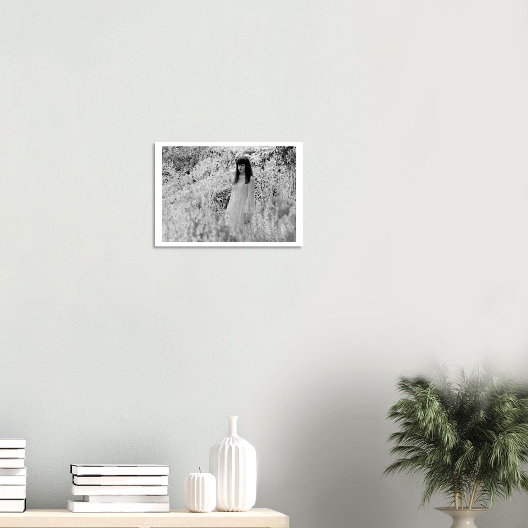 Transform your space with our captivating poster featuring a solitary figure in a flowing white dress gracefully standing amidst enchanting overgrown ruins. This stunning artwork captures a moment of tranquility and beauty, perfect for any room that seeks an inspiring focal point.