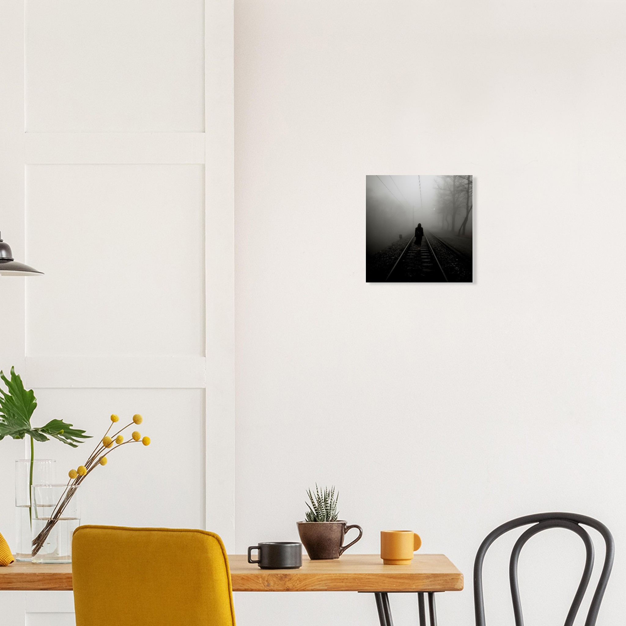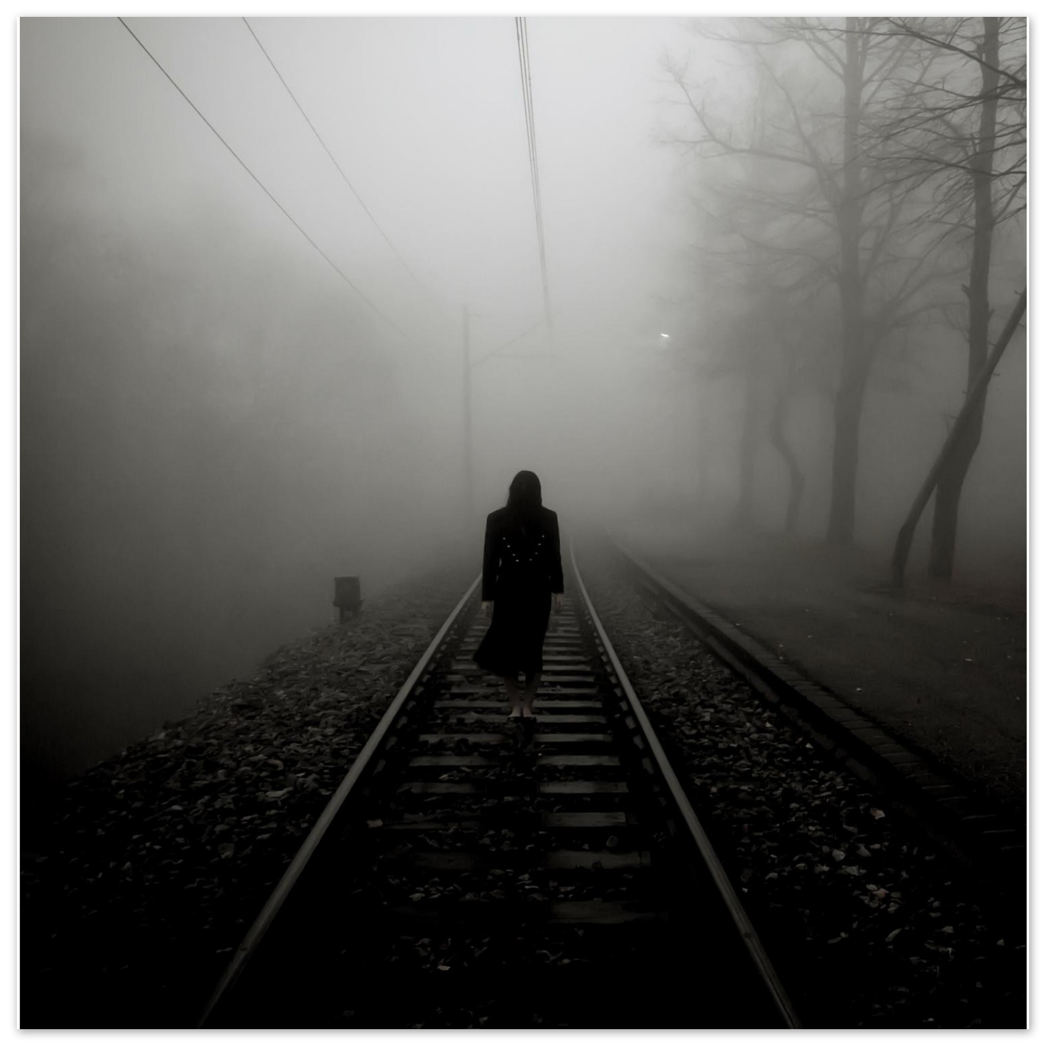 Embrace the haunting beauty of our Spooky Forest Poster, featuring a mysterious female figure in a black dress standing on a train trail surrounded by a misty forest. This captivating artwork adds an air of intrigue and elegance to any space, perfect for elevating your home decor or igniting your creative inspirations.